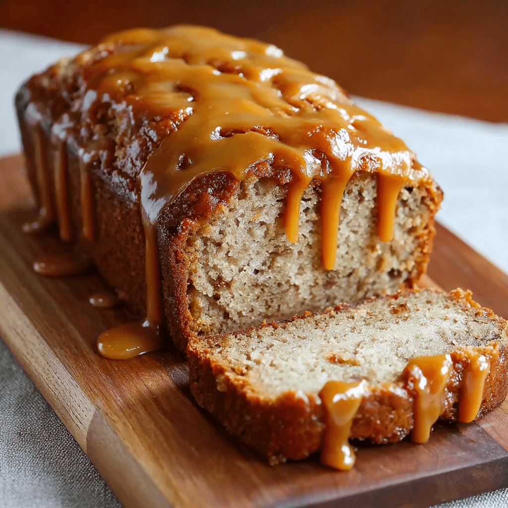 Banana bread with caramel drizzle is a comforting, bakery-style treat that combines the natural sweetness of ripe bananas with a rich, buttery loaf. The addition of warm caramel sauce adds a decadent finish, creating a moist, tender bread with a glossy, indulgent topping that elevates a classic quick bread into a dessert-worthy bake.