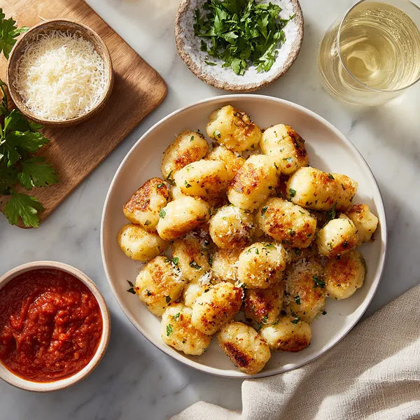 Air frying exposes gnocchi to rapid, circulating heat, allowing surface moisture to evaporate quickly and starches to crisp without deep frying. Olive oil facilitates Maillard browning, while seasoning before cooking builds flavor into the crust. Finishing with Parmesan while hot ensures adhesion and maximum umami. At approximately 280 calories per serving, this dish delivers indulgent texture with controlled fat content.