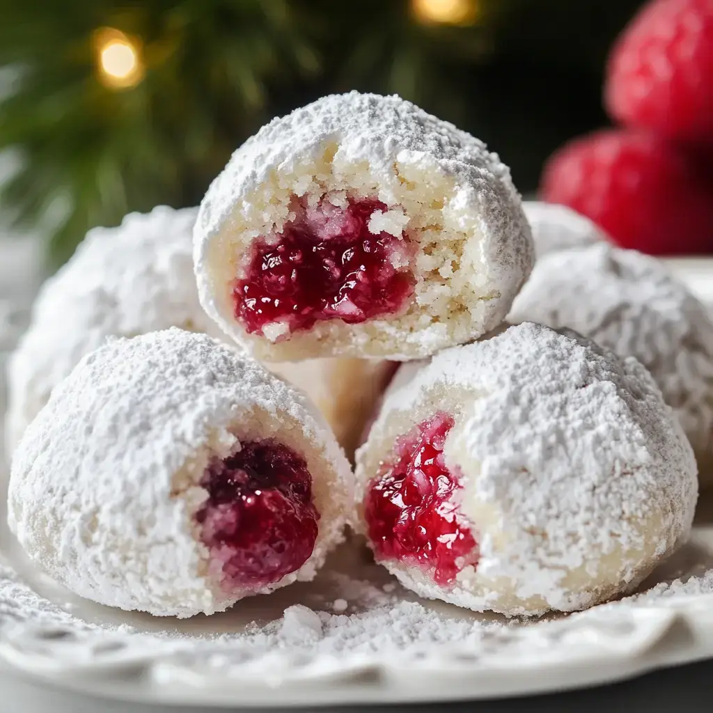 Raspberry Almond Snowballs are tender, buttery almond cookies with a sweet and tangy raspberry jam center, rolled in powdered sugar for a snowy finish. Each bite offers a delicate, melt-in-your-mouth texture with a fruity surprise tucked inside, making them a perfect treat for holidays or special occasions.