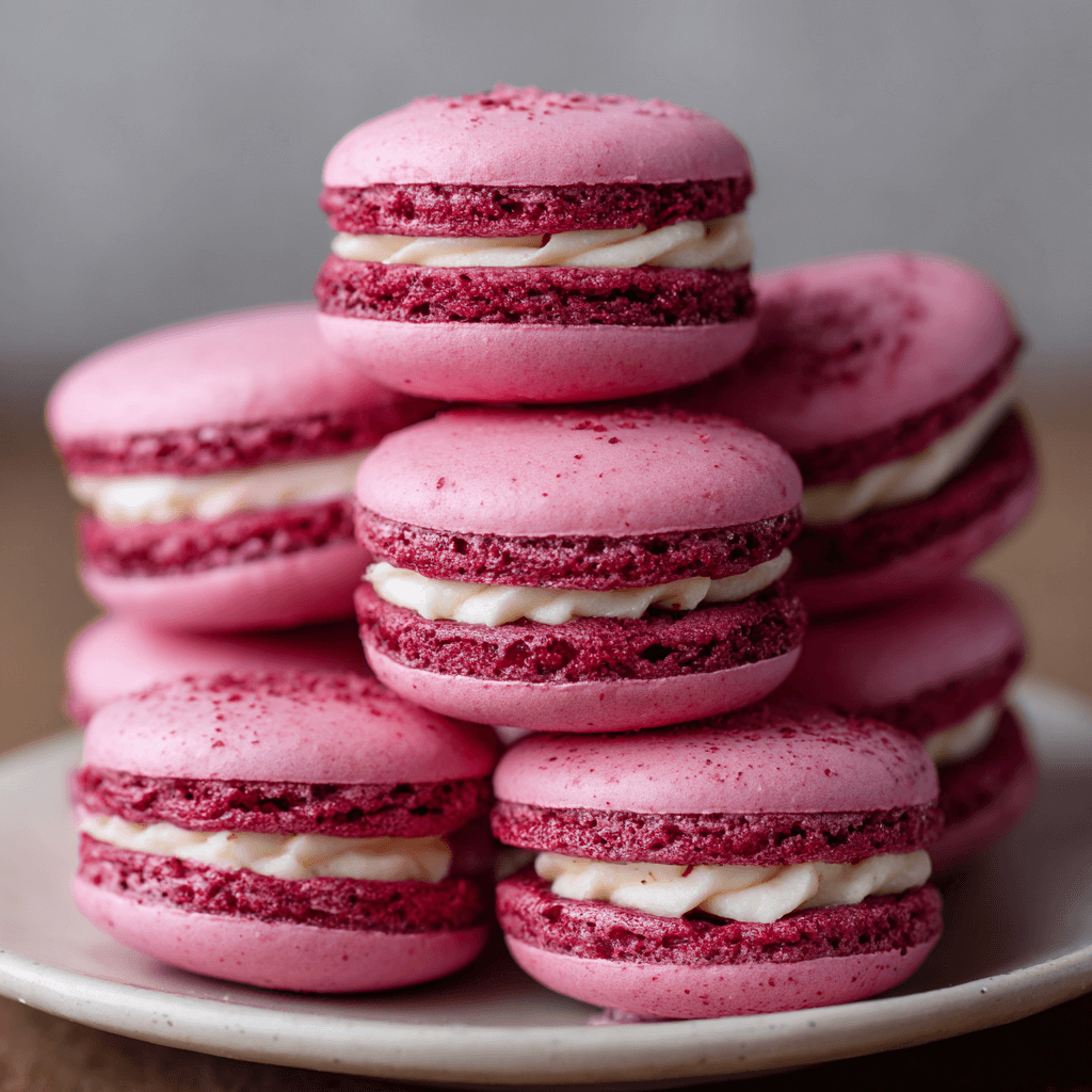 Raspberry Macaron Stack: An Elegant Tiered Patisserie.
