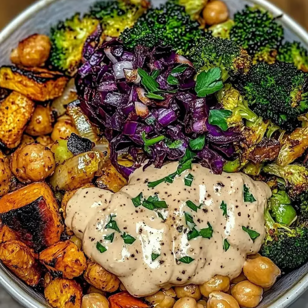 Roasting vegetables caramelizes their natural sugars, intensifying flavor and texture, while crisped chickpeas provide a crunchy protein boost. The maple-dijon tahini dressing balances savory, sweet, and tangy notes, creating a cohesive bowl that’s satisfying, nutritious, and visually appealing.