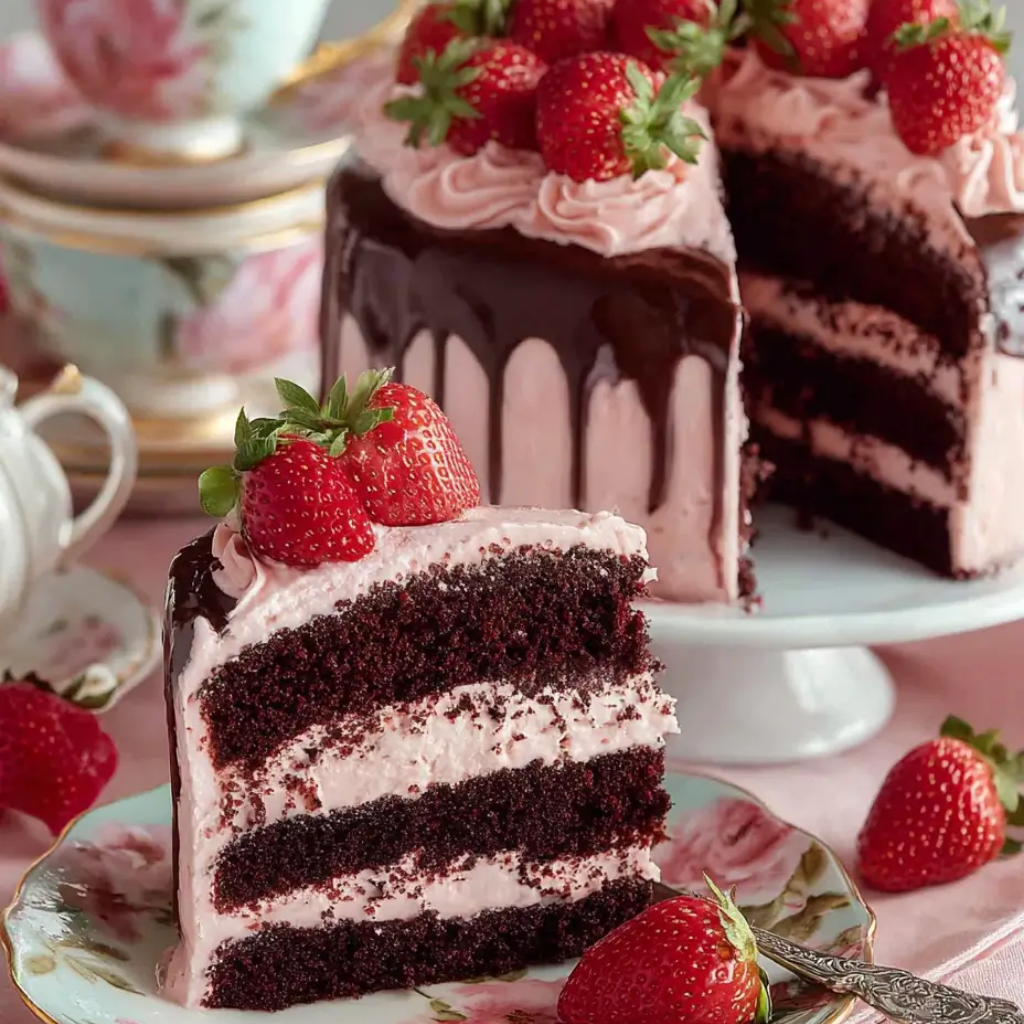 The Strawberry Chocolate Shell Cake is a stunning dessert that plays with the classic “chocolate-covered strawberry” flavor profile in a grand, multi-layered format. The centerpiece of this cake is the “magic shell” finish—a glossy, thin layer of chocolate that creates a satisfying snap when sliced, revealing a vibrant, pink strawberry interior.